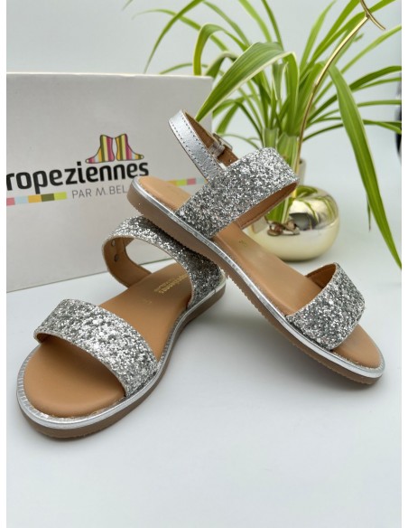 Sandales IENA à larges brides à paillettes argentée pour fillette ainsi qu'une boucle métallique permettant de les ajuster. Modèle doté d'une semelle synthétique.
